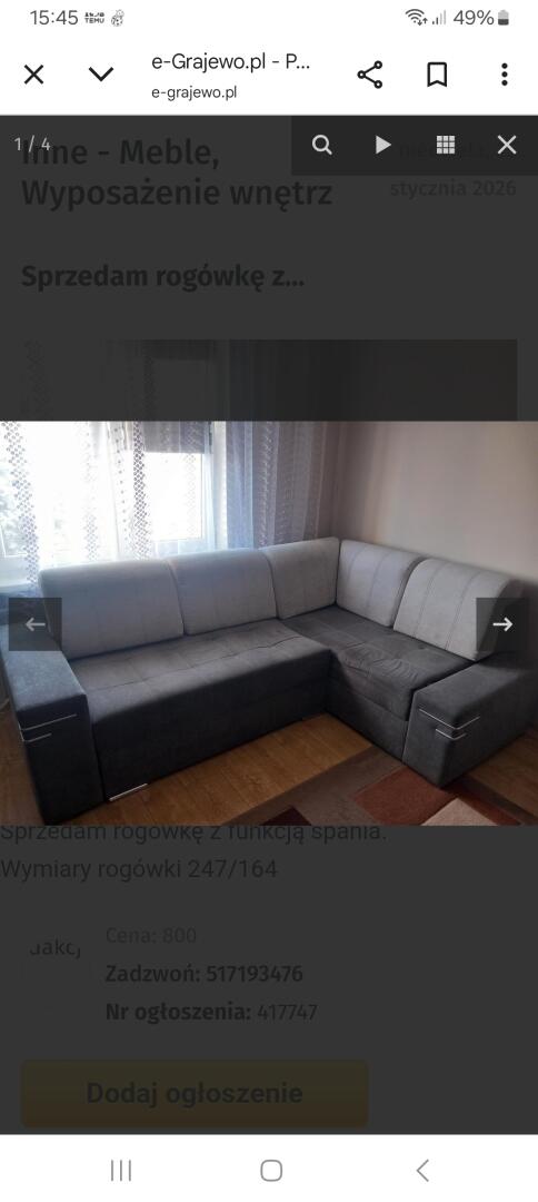 Grajewo ogłoszenia: Posiadam na sprzedaż rogówkę, segment,dwa fotele,...