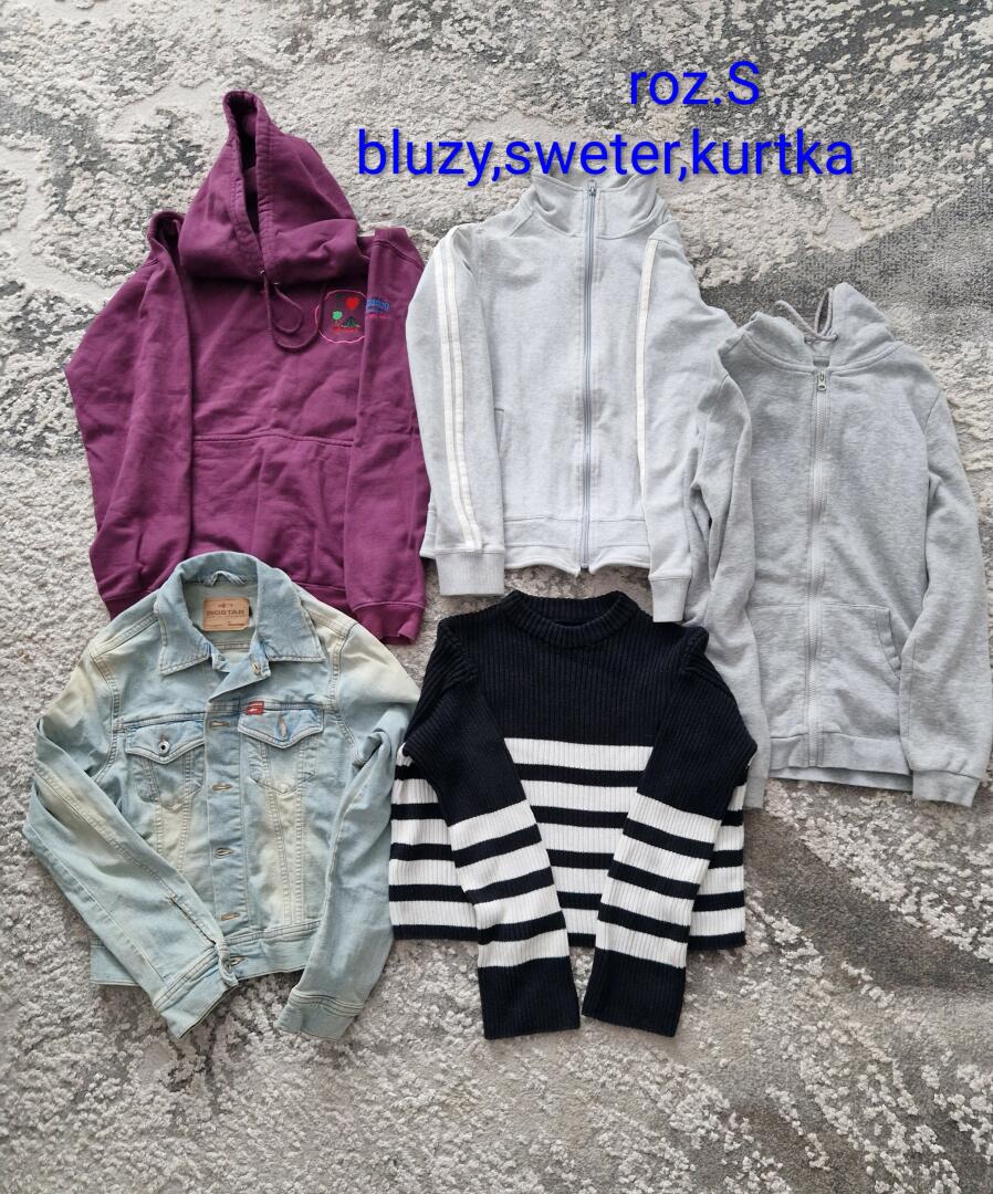 Sprzedam ubrania roz S. 3bluzy,sweter,kurtka dżinsowa. Stan dobry.
