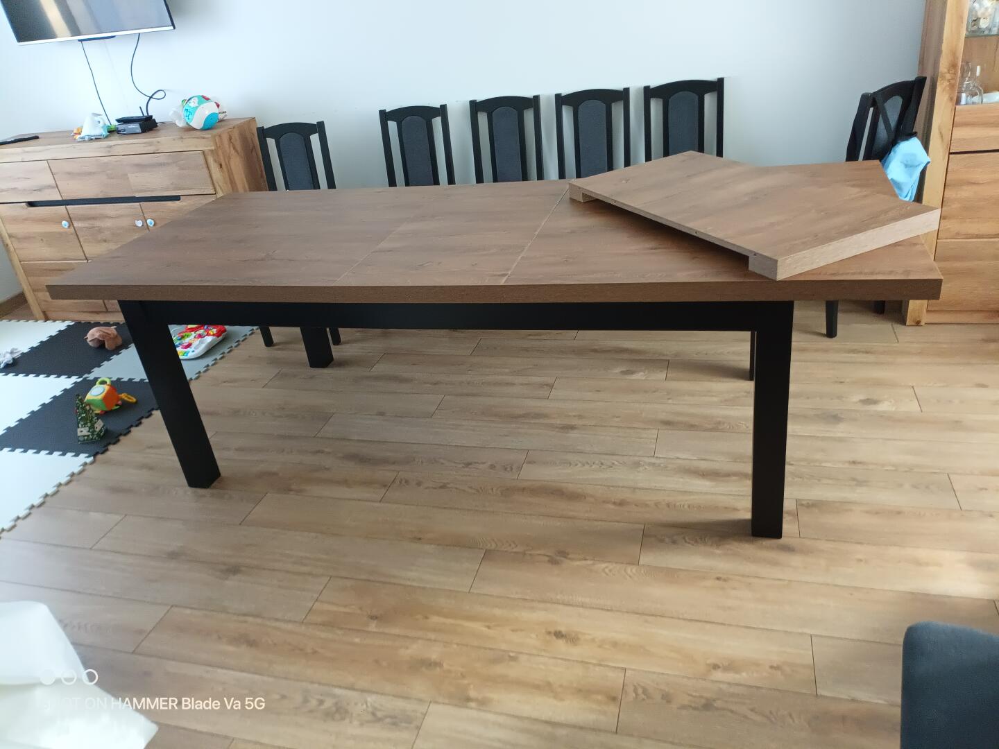 Sprzedam duży stół rozkładany góra płyta laminowana dąb Lancelot podstawa z drewna buk kolor czarny wymiary szerokość 1m